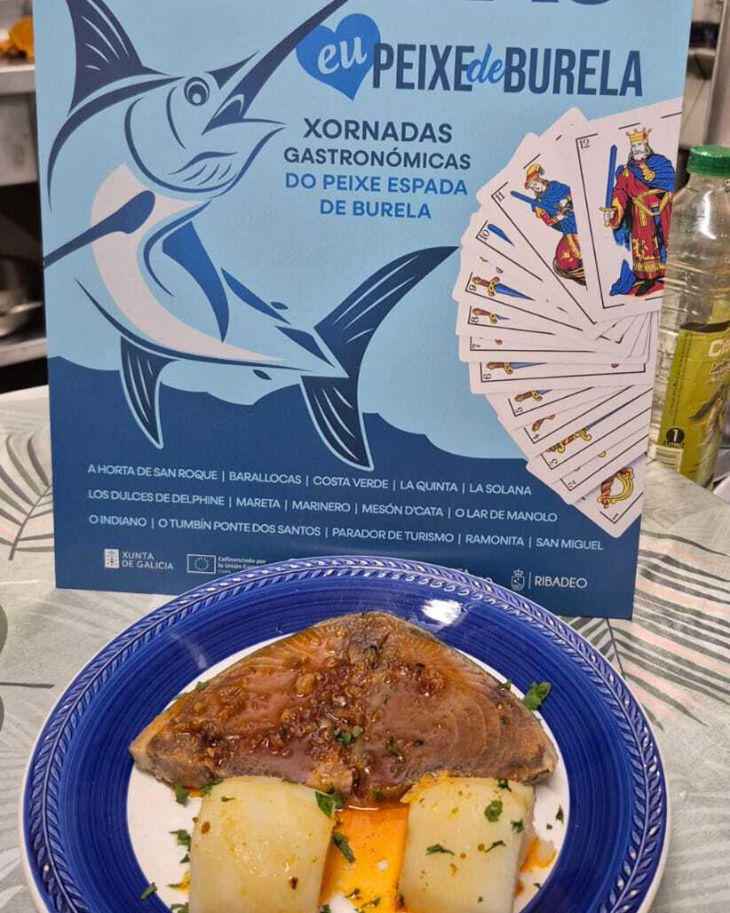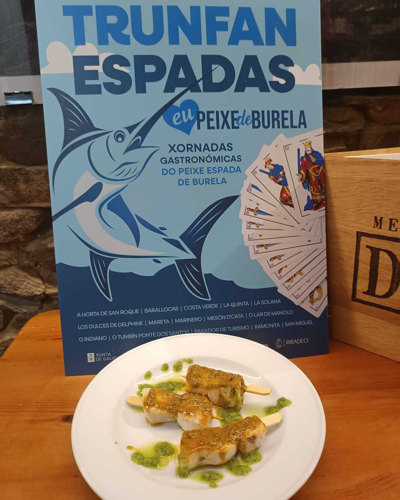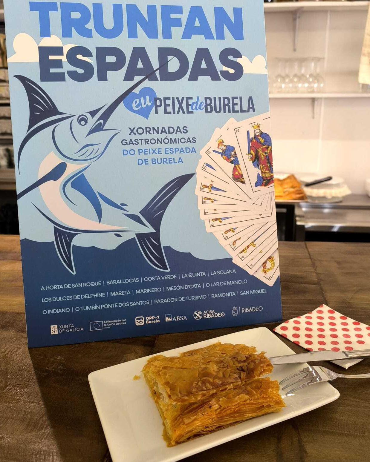 Acisa Ribadeo organiza este fin de semana las Jornadas Gastronómicas del Pez Espada de Burela, en las que participan 15 locales hosteleros: O Lar de Manolo, La Quinta, A Horta de San Roque, O Indiano, La Solana, San Miguel, Parador de Turismo, Ramonita, Costa Verde, Mesón D´Cata, Mareta, O Tumbín Ponte dos Santos, Marinero, Barallocas y Los Dulces de Delphine.