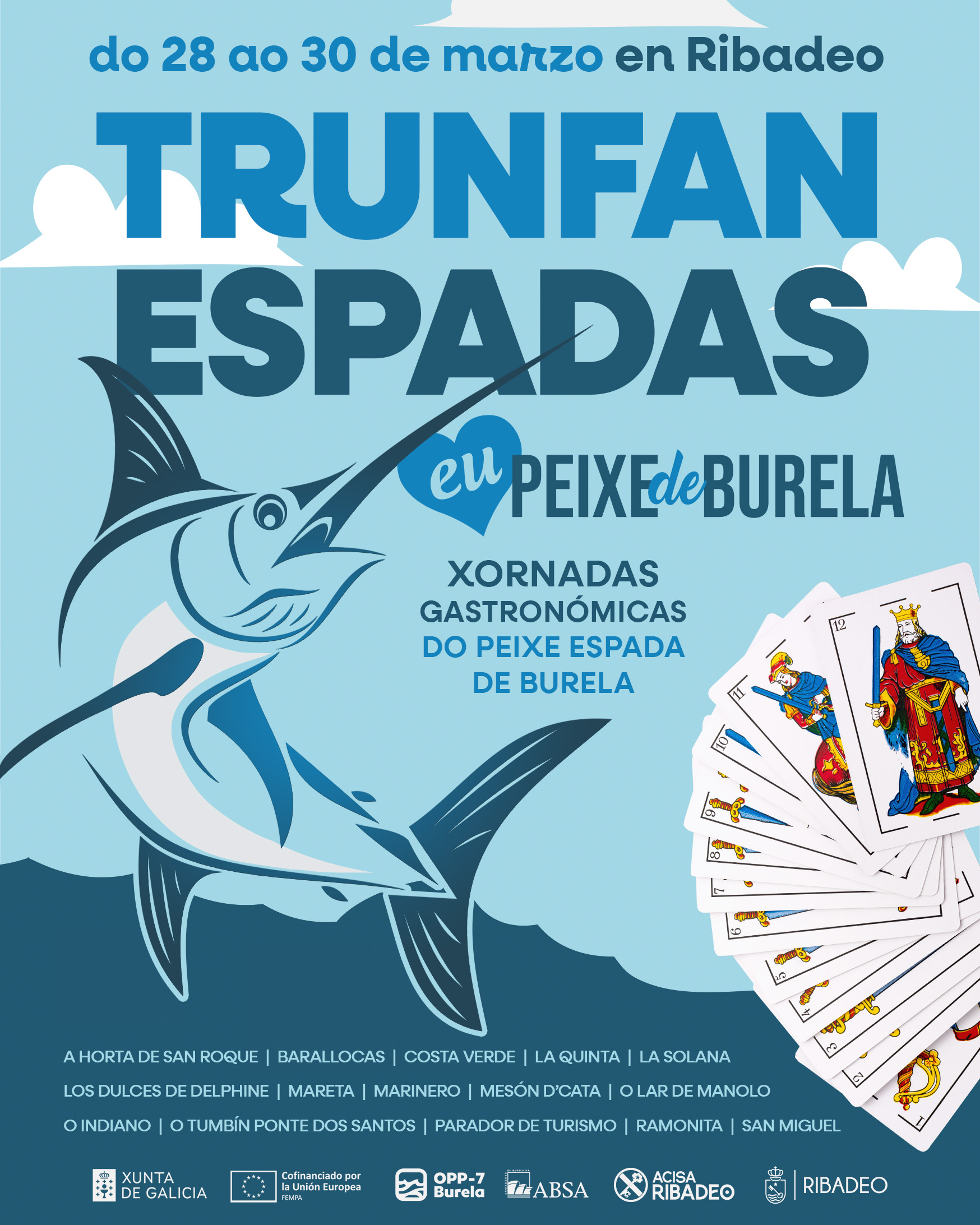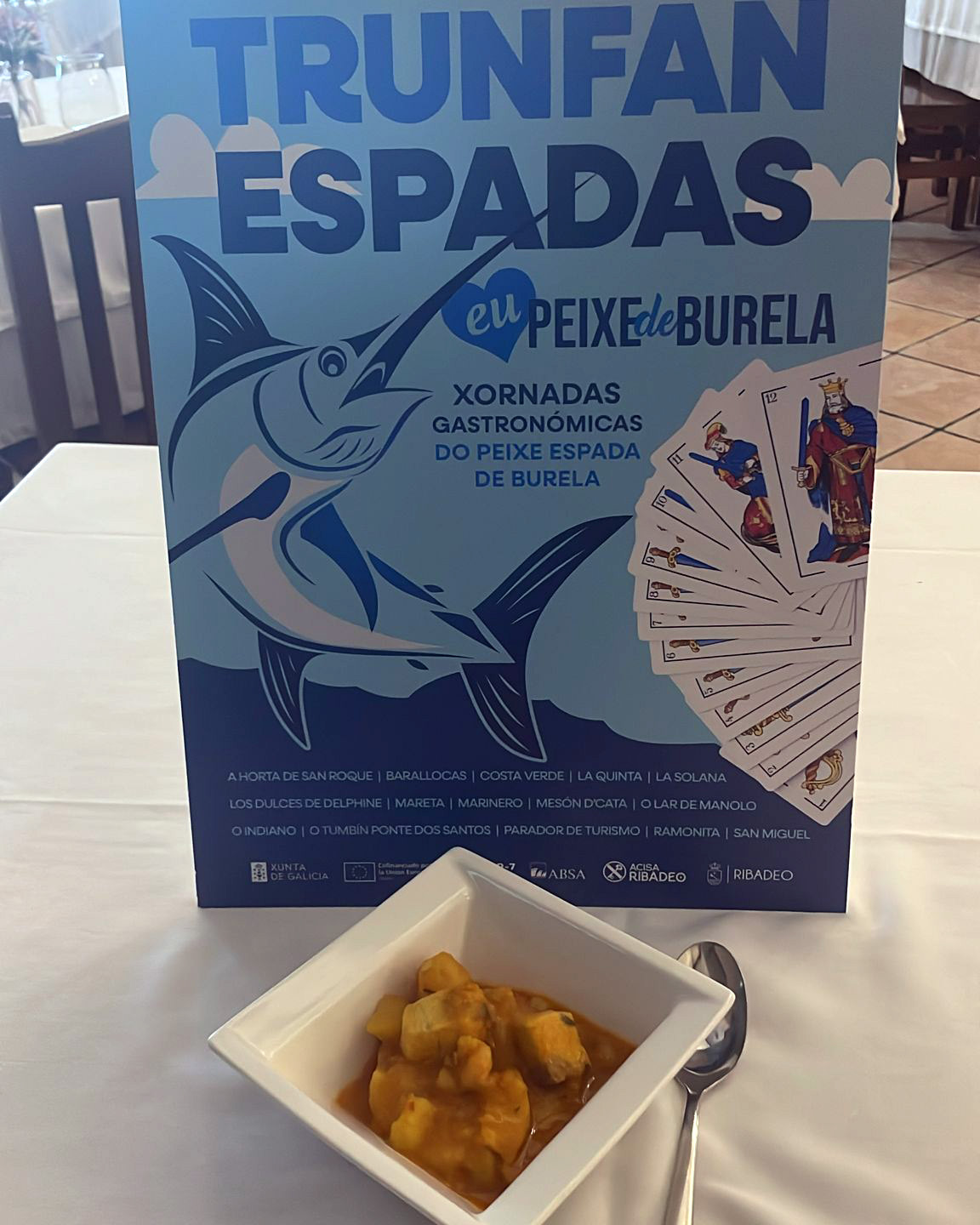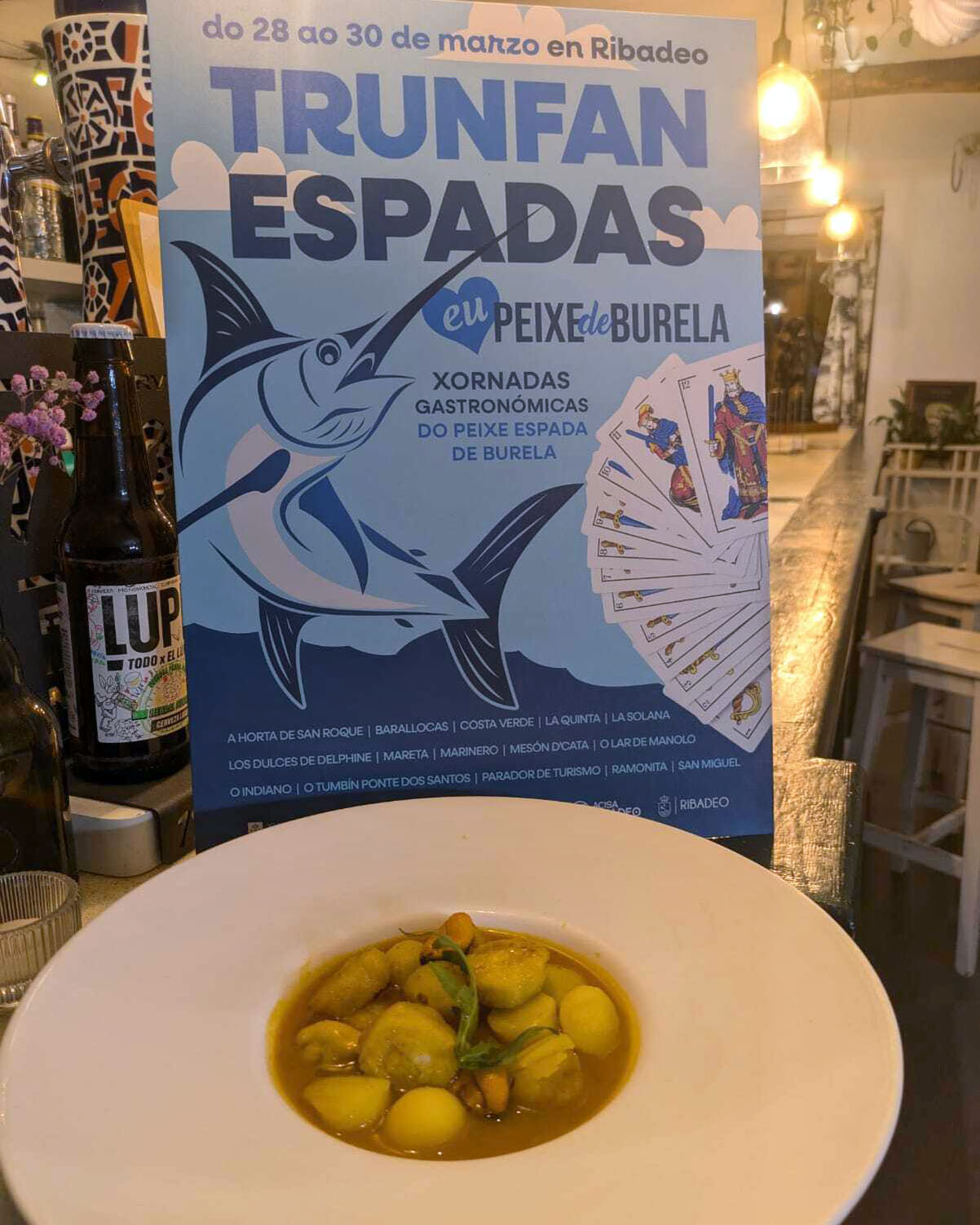 Acisa Ribadeo organiza este fin de semana las Jornadas Gastronómicas del Pez Espada de Burela, en las que participan 15 locales hosteleros: O Lar de Manolo, La Quinta, A Horta de San Roque, O Indiano, La Solana, San Miguel, Parador de Turismo, Ramonita, Costa Verde, Mesón D´Cata, Mareta, O Tumbín Ponte dos Santos, Marinero, Barallocas y Los Dulces de Delphine.