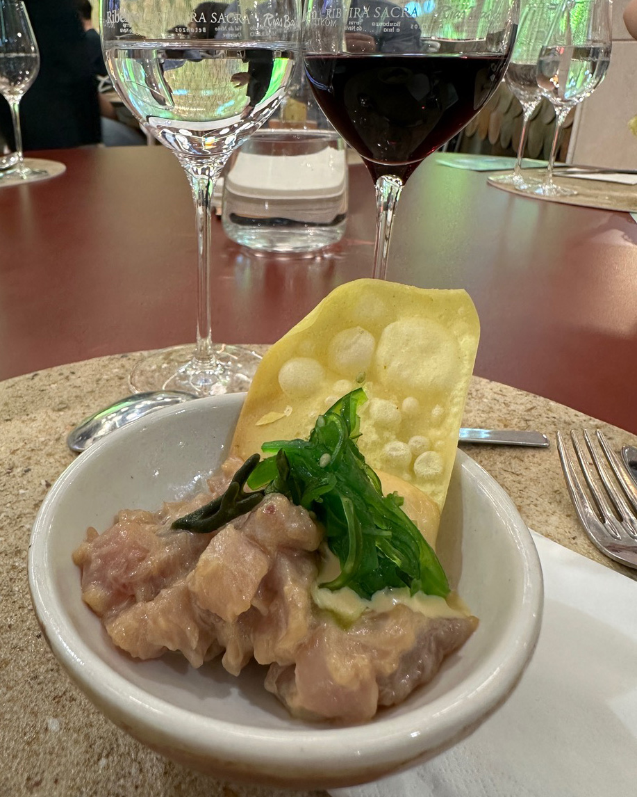 > Tartar de Bonito D& Burela con crema de soja y tantán