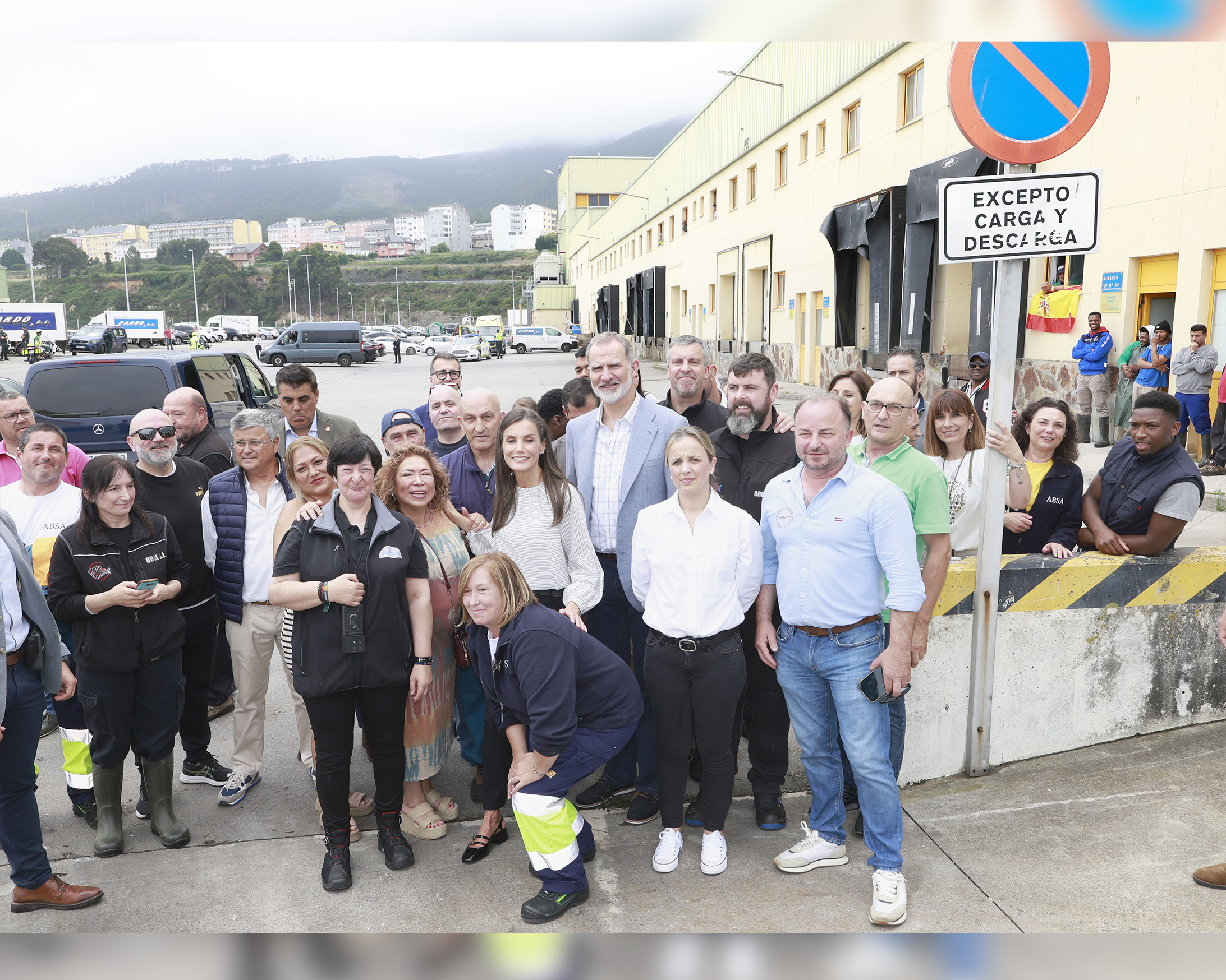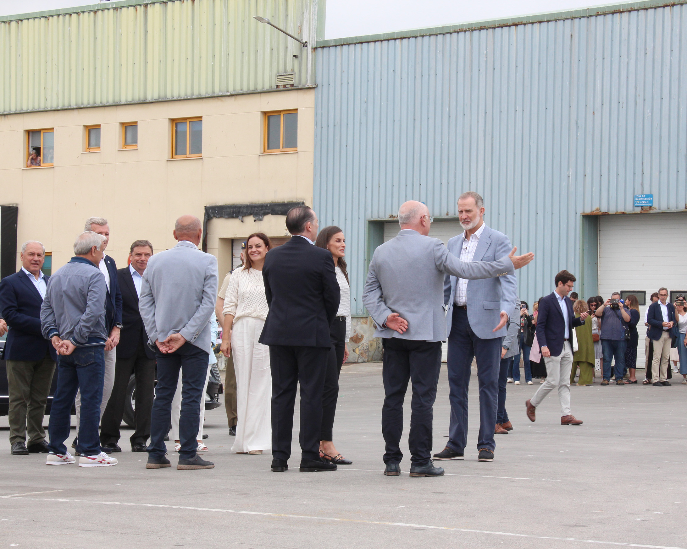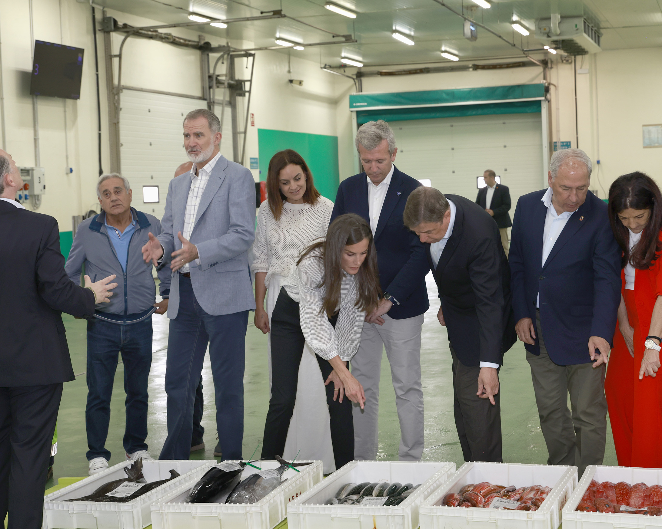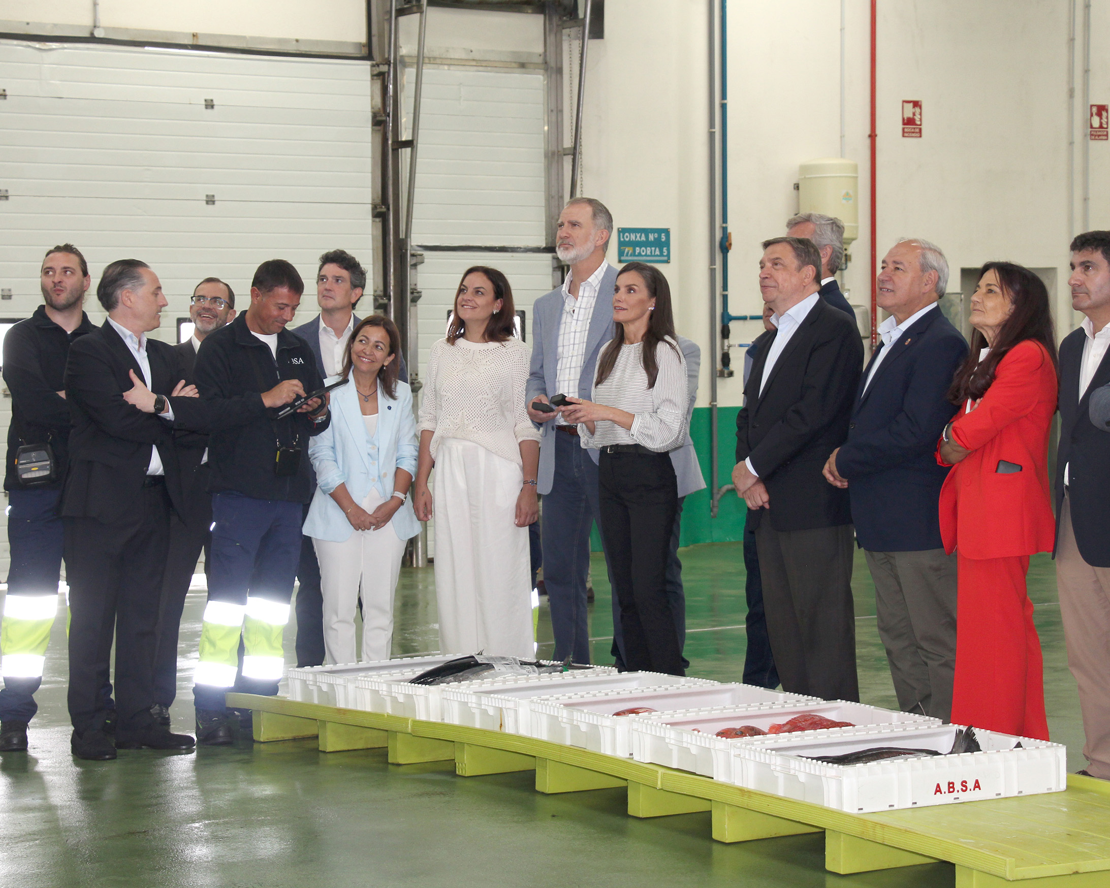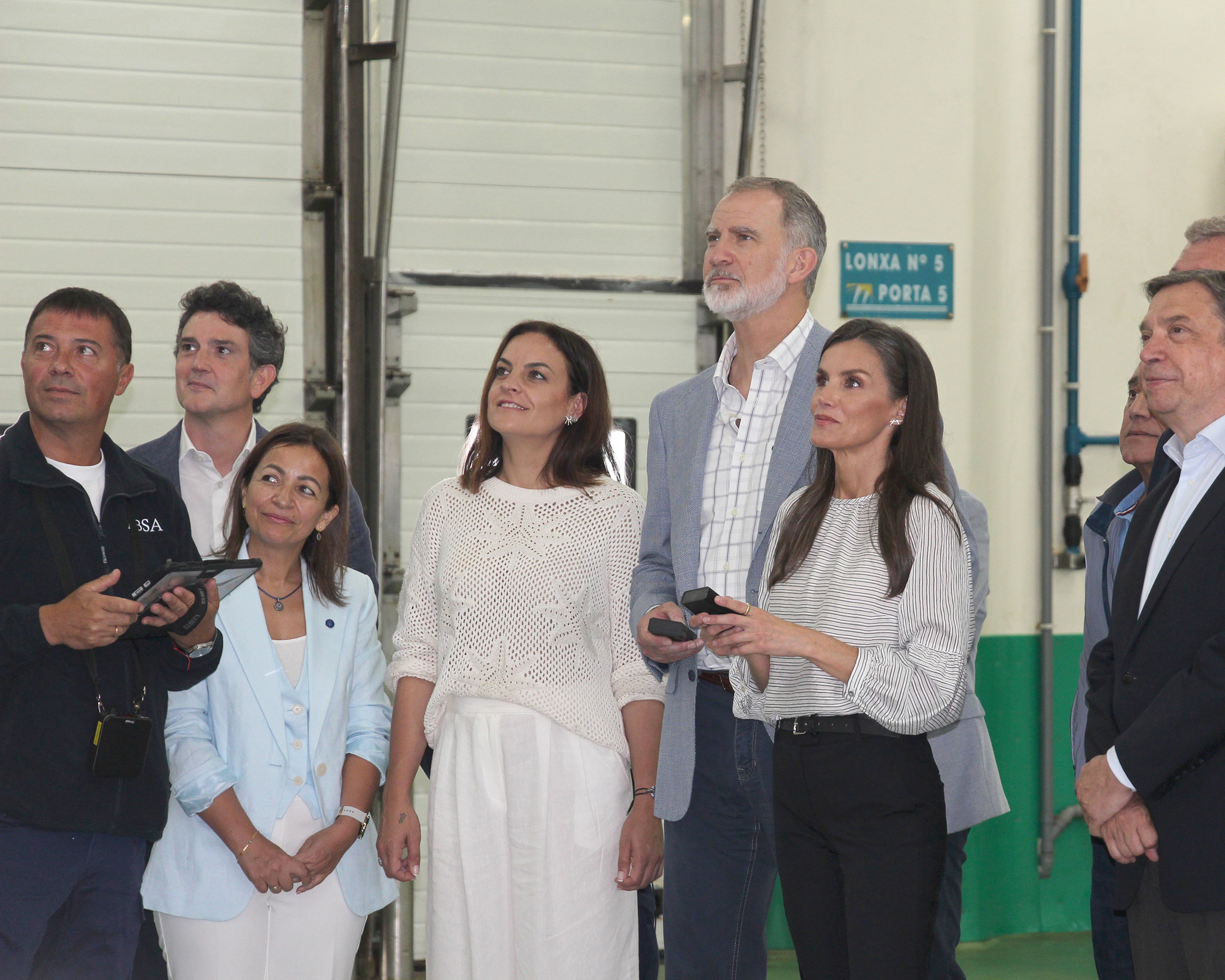 Dentro de su visita a Burela, SSMM los Reyes se acercaron hasta la lonja de Armadores de Burela, visitaron sus instalaciones y conocieron su funcionamiento, que combina tradición y modernidad, ya que se trata de una lonja de pescado única con subasta oral automatizada.
