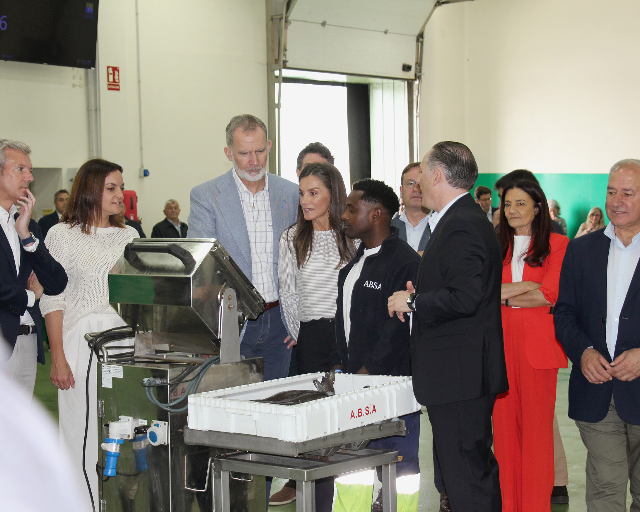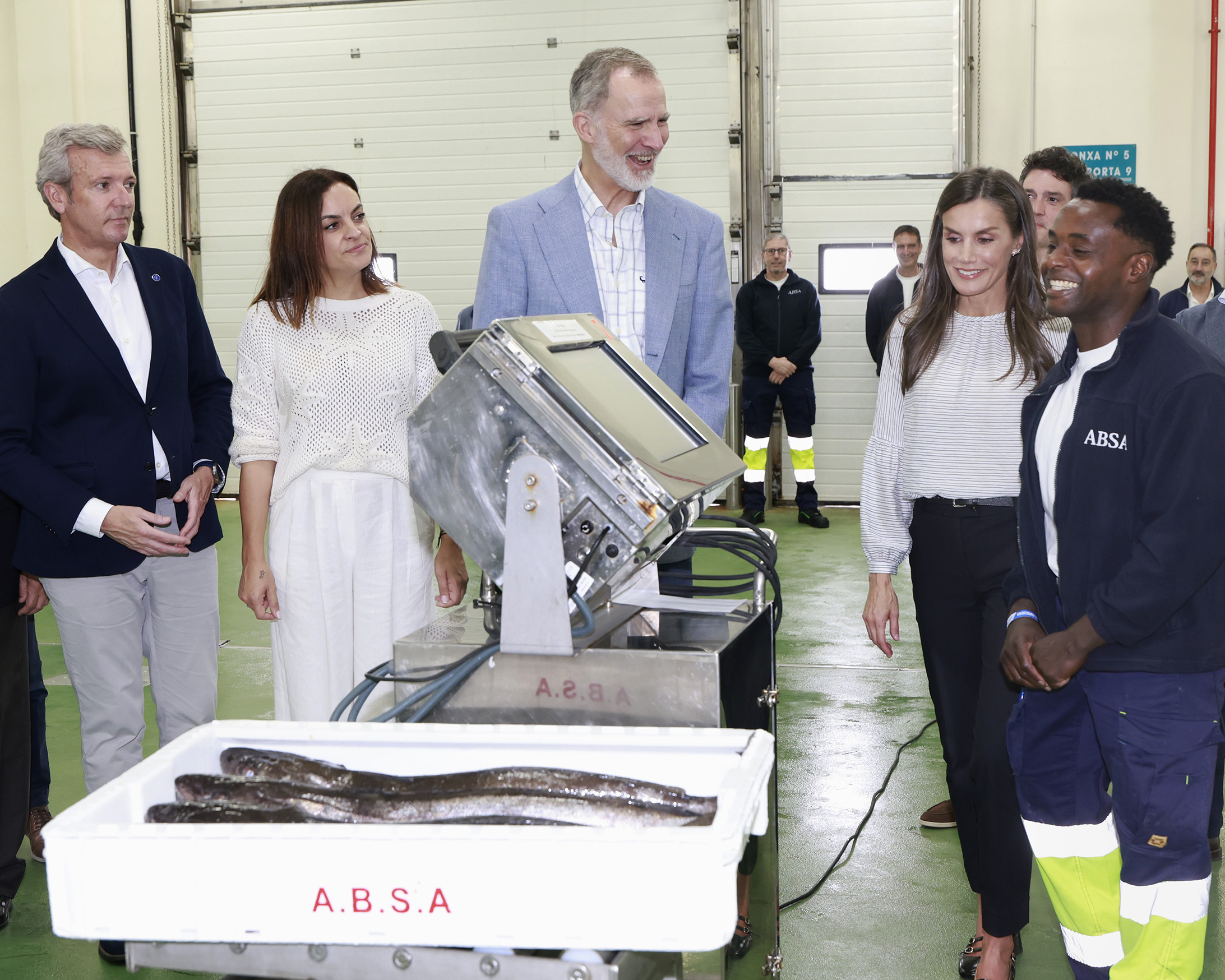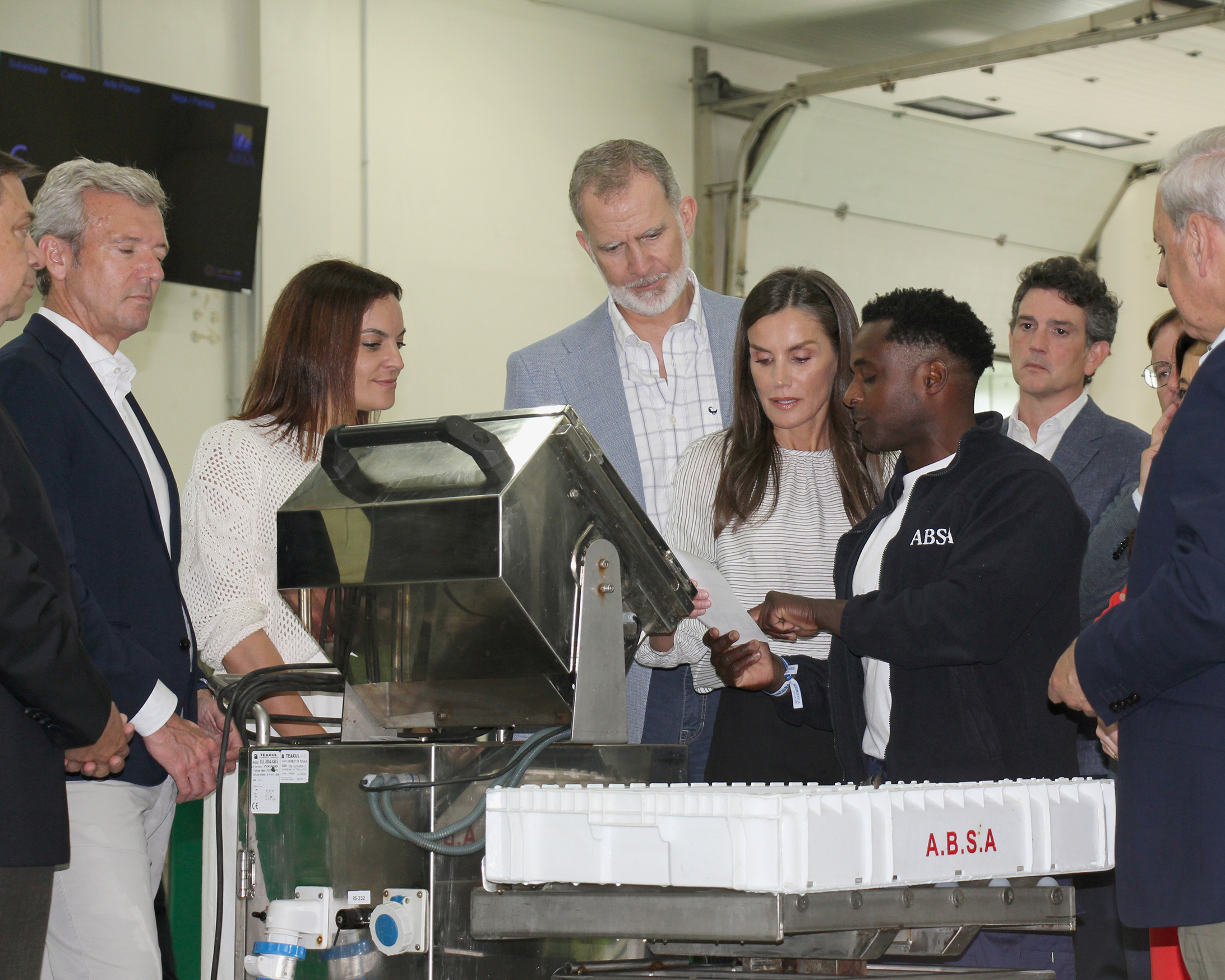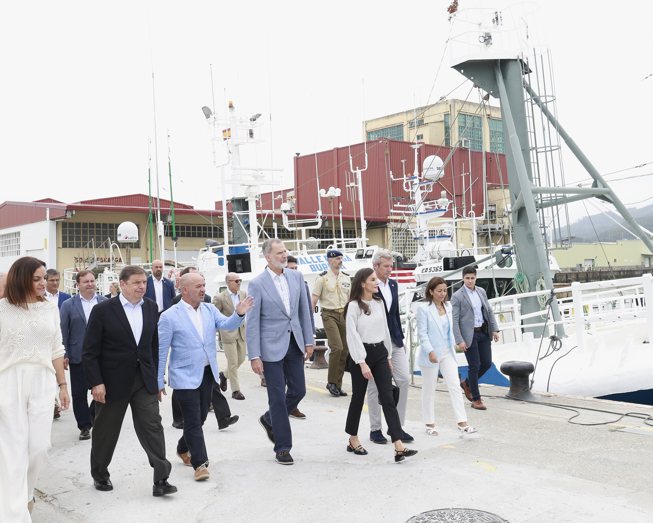 Dentro de su visita a Burela, SSMM los Reyes se acercaron hasta la lonja de Armadores de Burela, visitaron sus instalaciones y conocieron su funcionamiento, que combina tradición y modernidad, ya que se trata de una lonja de pescado única con subasta oral automatizada.