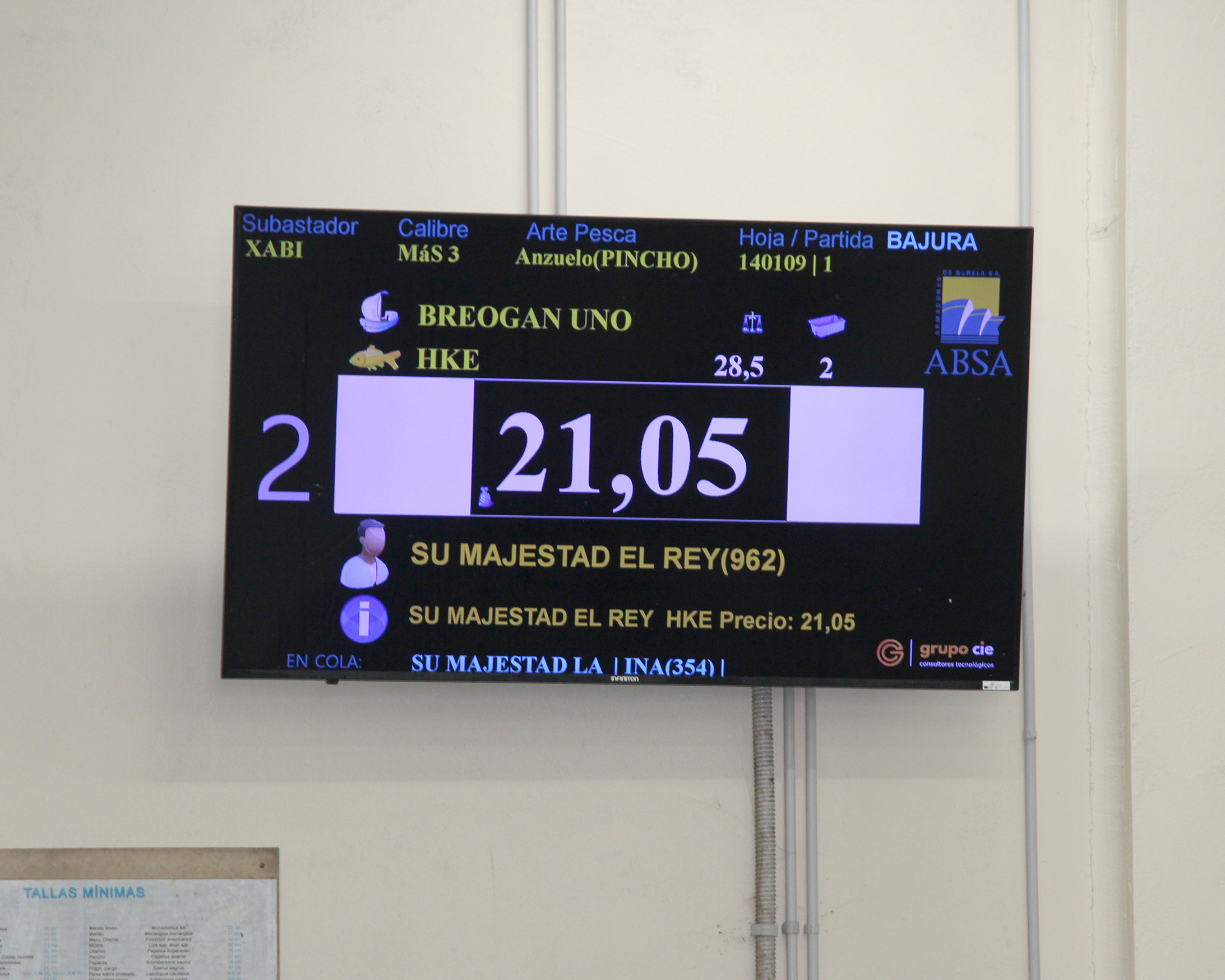 Allí Felipe VI y Letizia pujaron por un lote de merluza y otro de bonito, las dos especies emblemáticas de nuestras flotas y que convierten a Burela en el primer puerto de Europa en merluza del pincho y el primero de Galicia en bonito del norte, además de muchas otras especies (hasta 122 diferentes especies se subastan cada año en esta lonja).