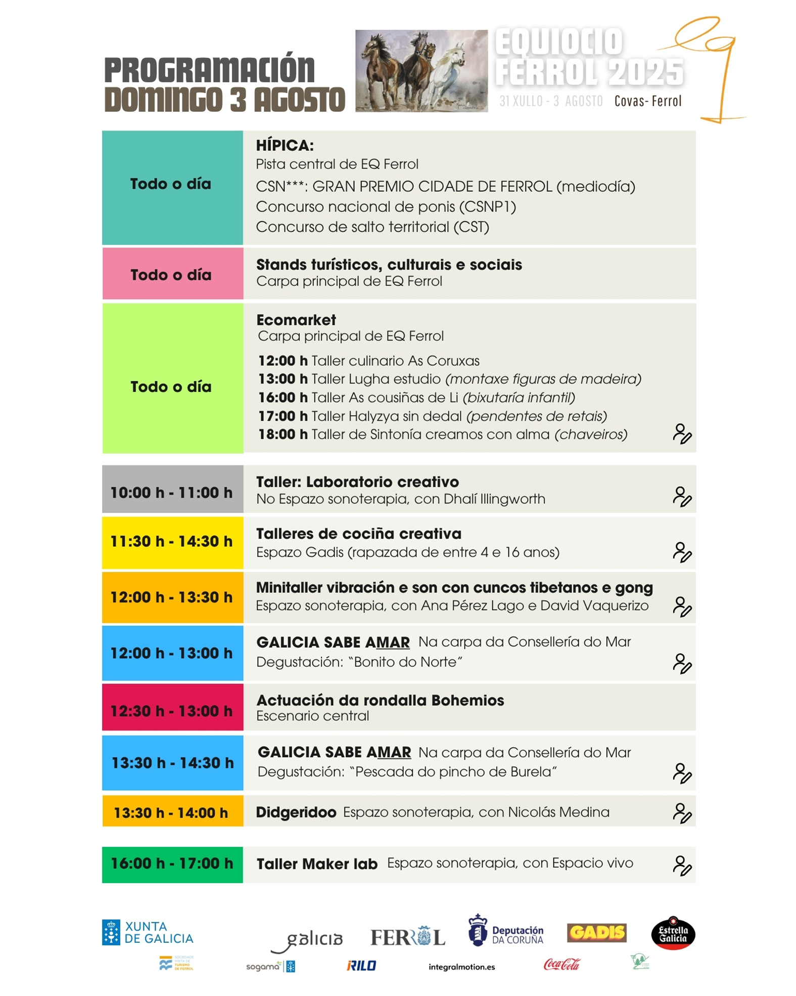 Un año más hemos colaborado con Equiocio Ferrol 2025, un evento que se celebró del 31 de julio al 3 de agosto en el campo de As Cabazas (Covas, Ferrol) y que combina la competición deportiva hípica con una programación llena de acciones relacionadas con el medio ambiente, la cultura, el compromiso social, la gastronomía y la promoción turística.