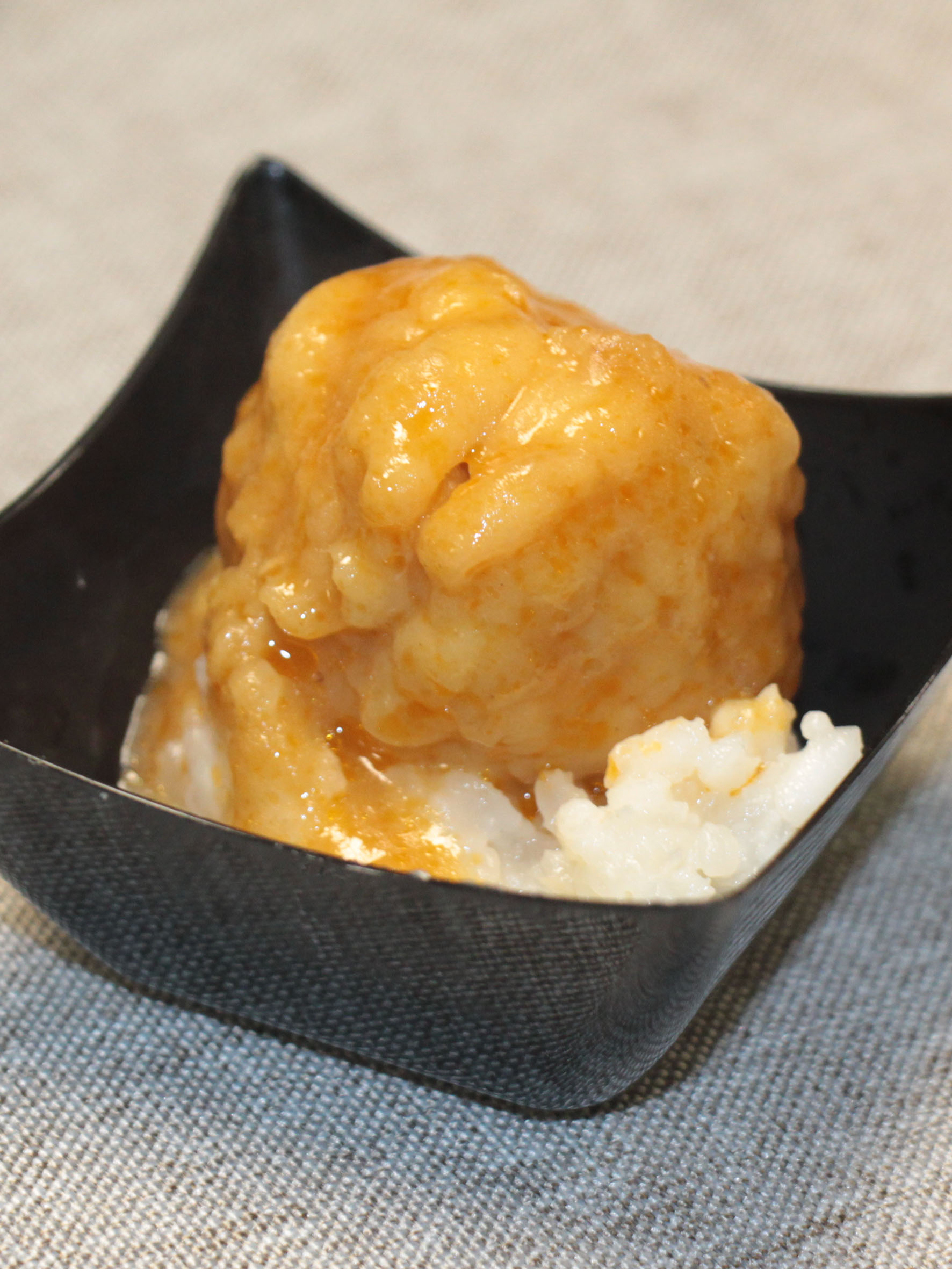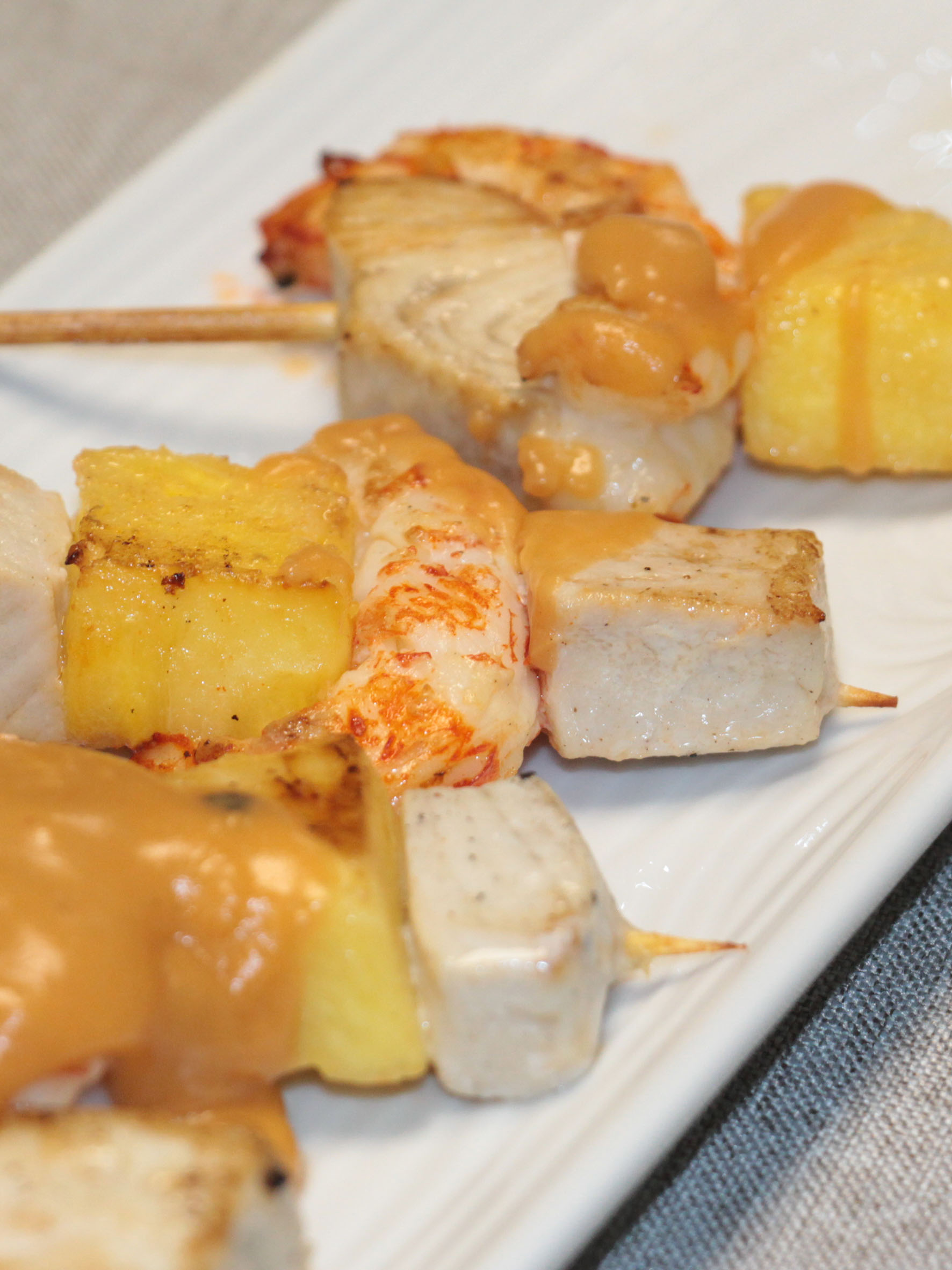 > Brocheta de pez espada con piña, langostino y salsa de langostino