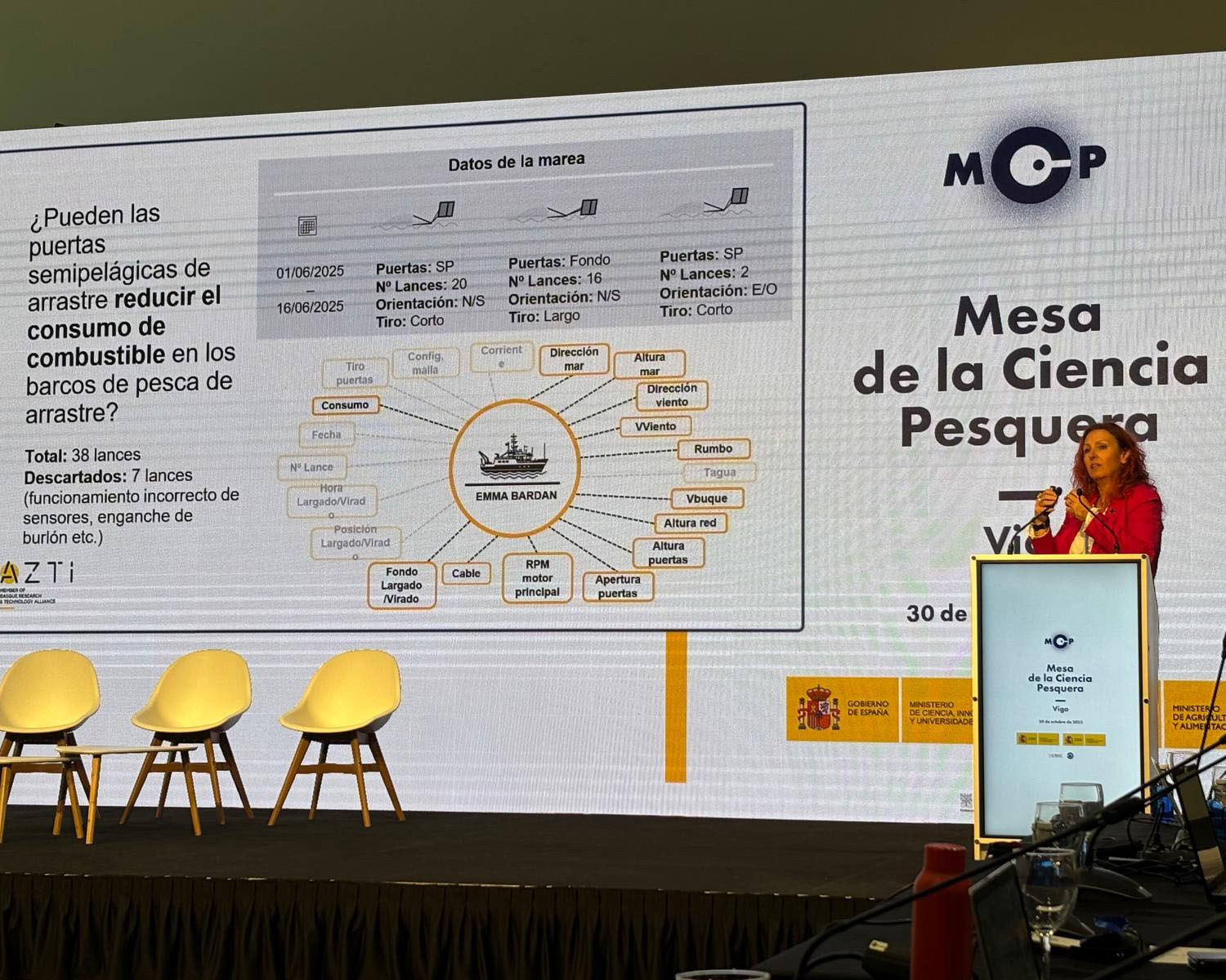 Julio Valeiras expuso la metodología del proyecto y presentó los resultados de 3 años y 161 lances de pesca con 3 tipos de redes comerciales distintas: datos de rendimientos de capturas y de ahorro para cada tipo de red y puerta utilizada. En sus conclusiones destacó que la utilización de este tipo de puertas voladoras o semi-pelágicas es una solución viable para la sostenibilidad ambiental y la eficiencia energética en la pesca de Arrastre. Los mejores resultados se obtienen cambiando las puertas y adaptando el arte de pesca.