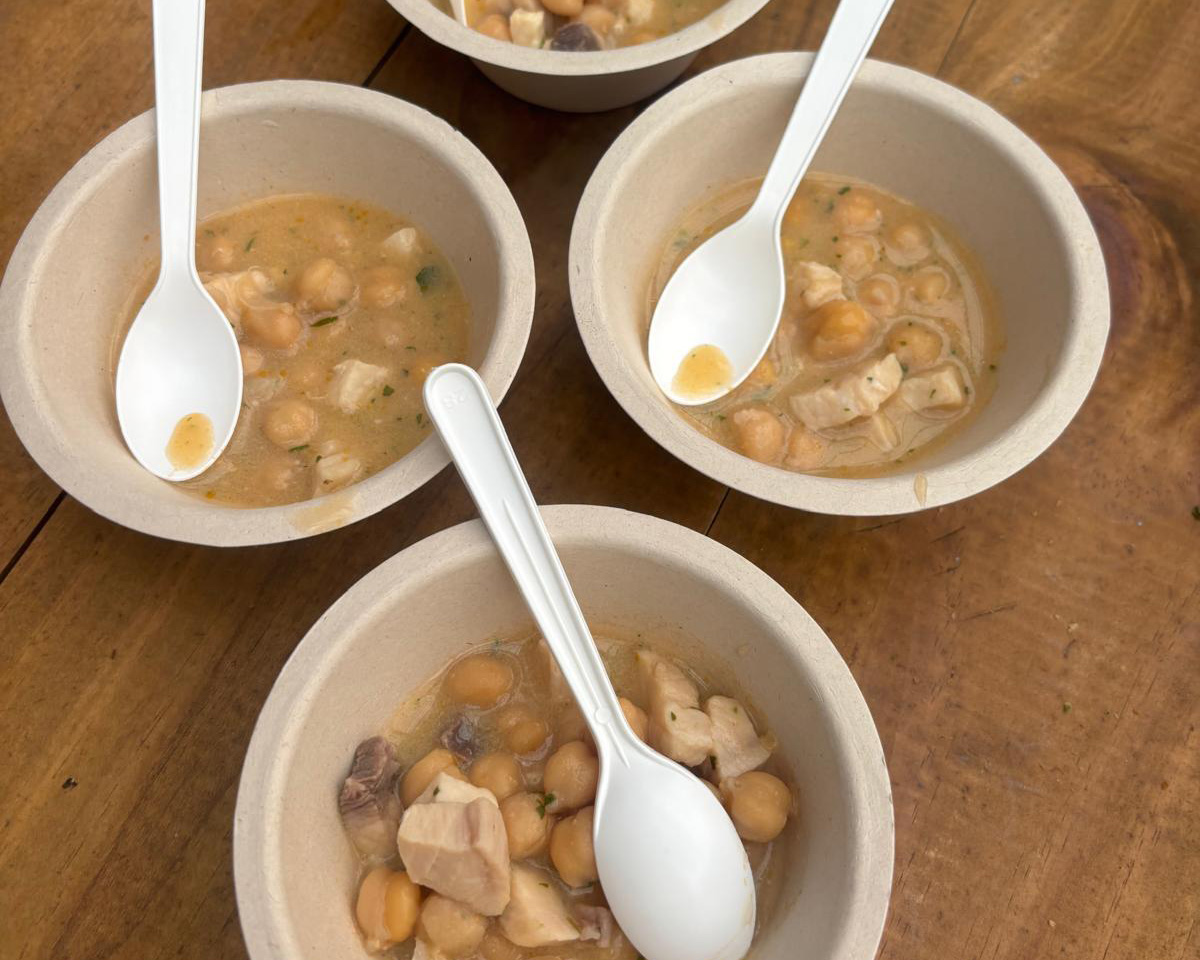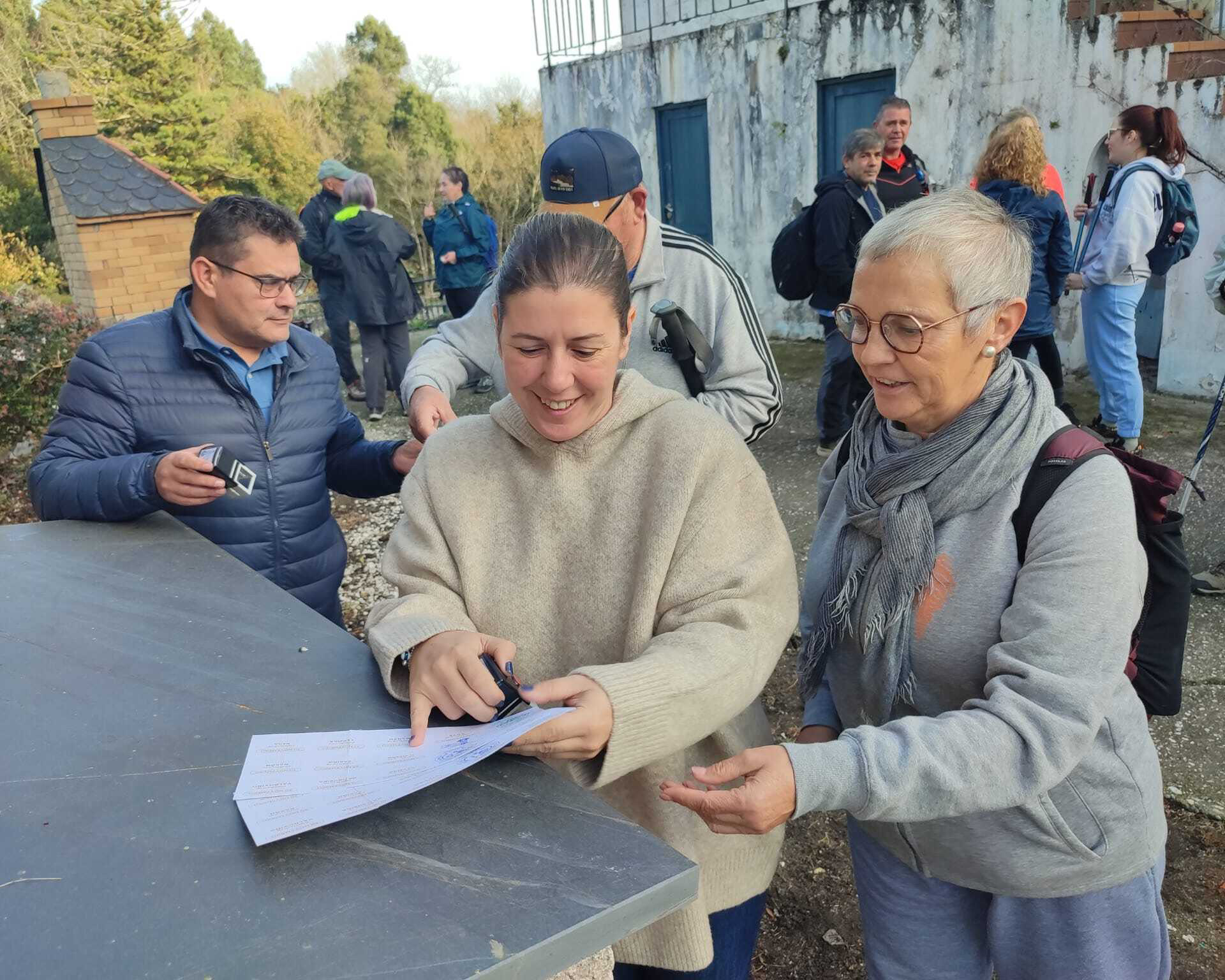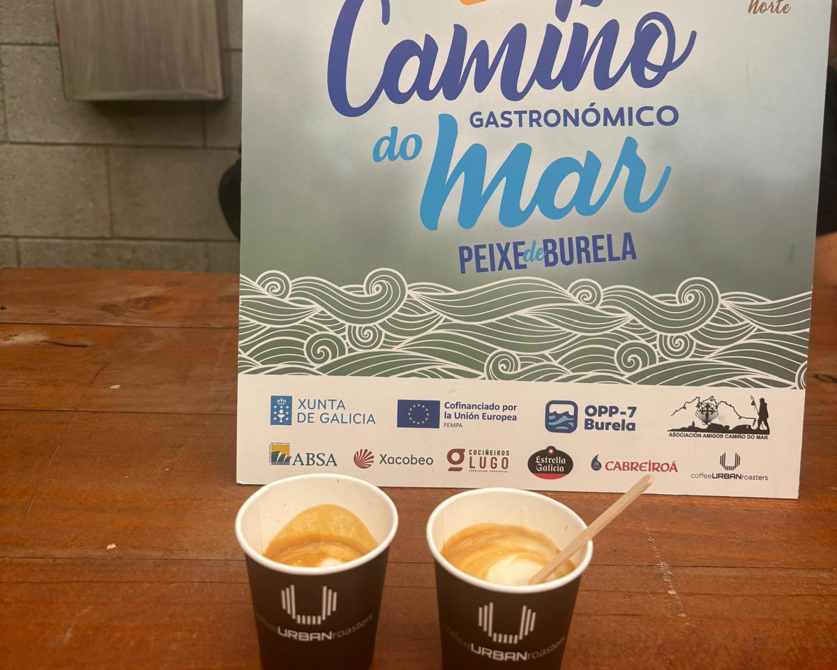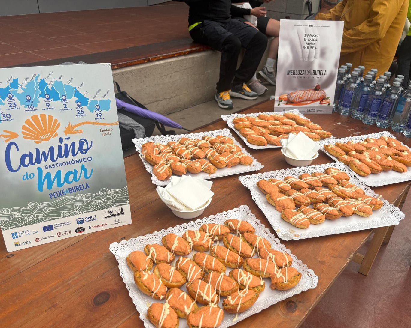 Al final de la etapa, el grupo pudo sellar sus «Compostelas» y reponer fuerzas con una degustación gastronómica «Peixe de Burela» con productos de la lonja de Burela y la colaboración de Estrella Galicia, Cabreiroá y Coffee Urban Roasters.