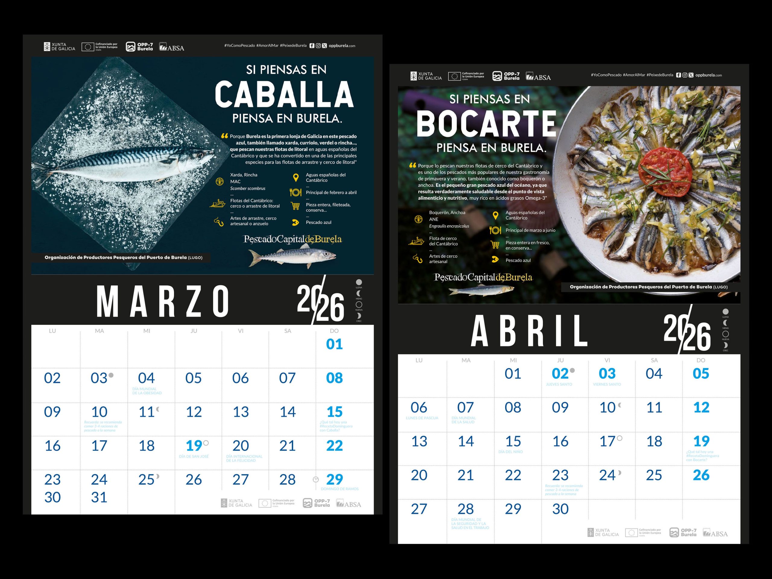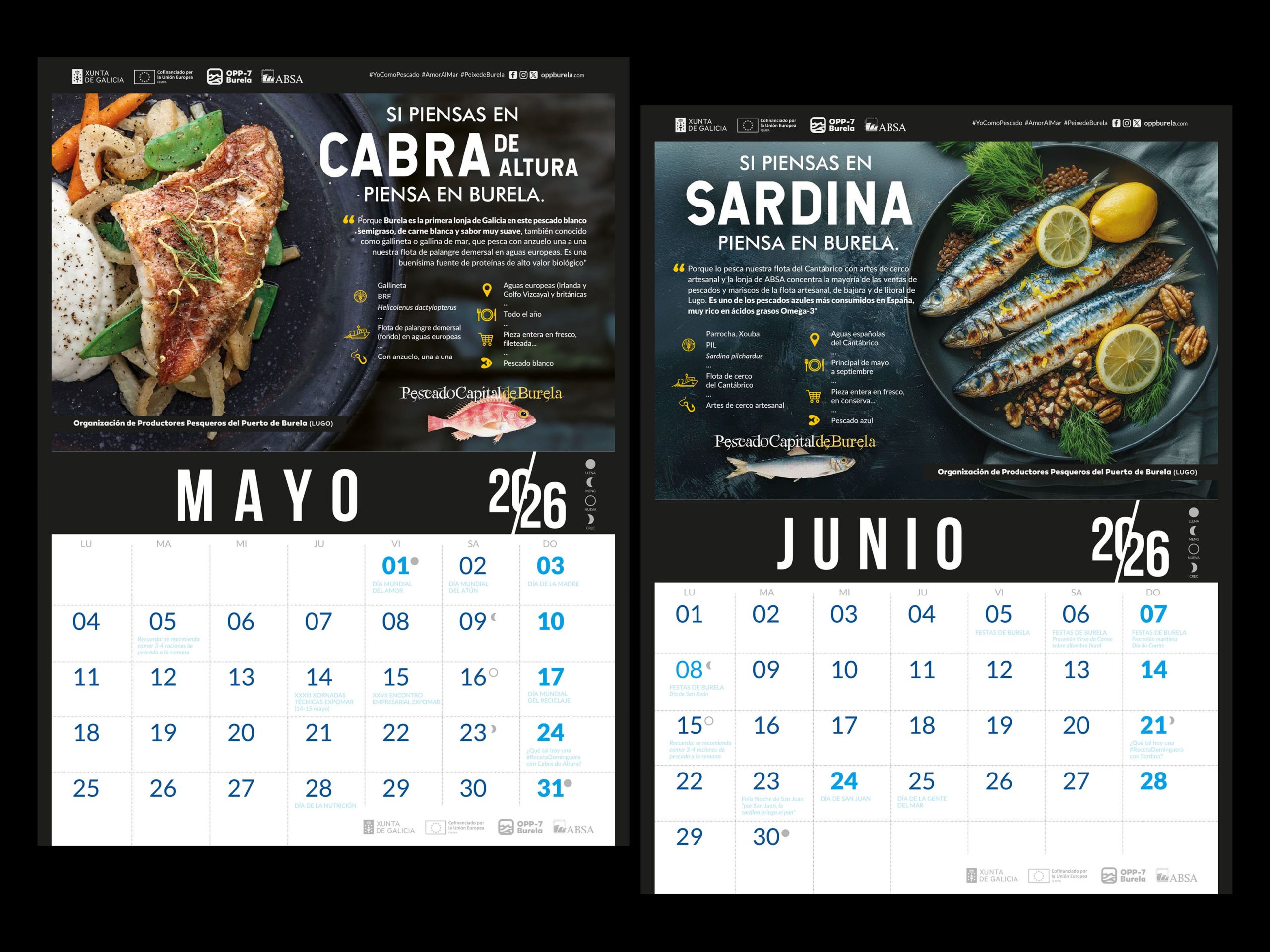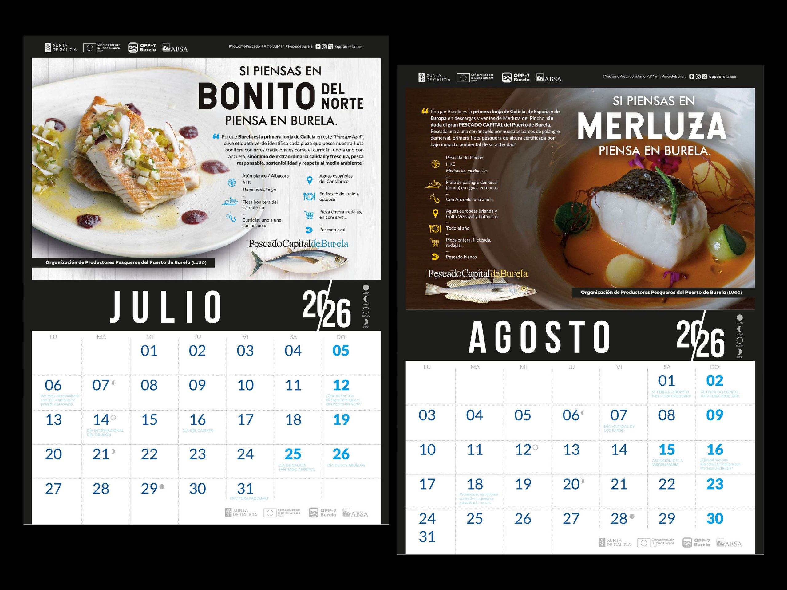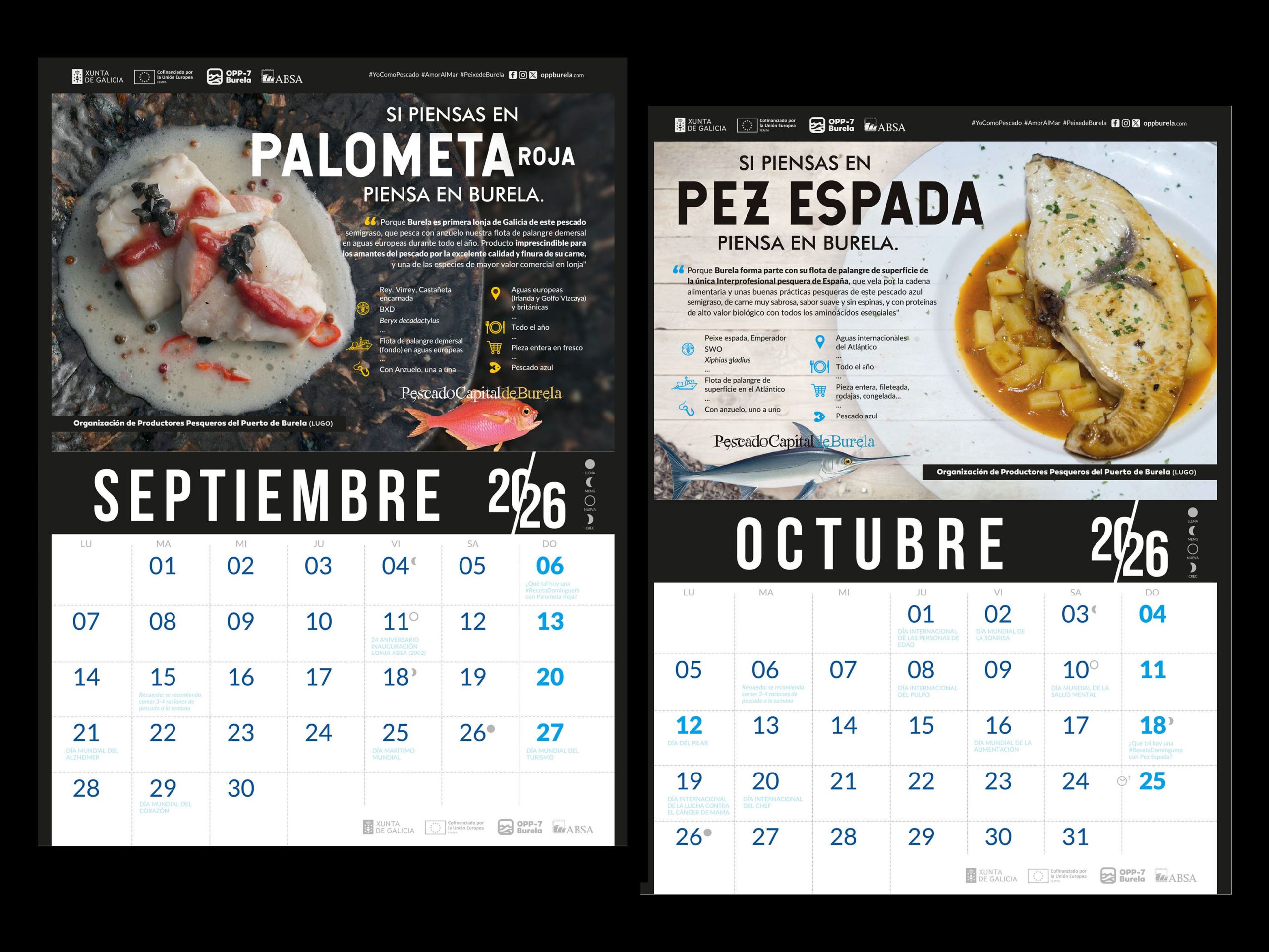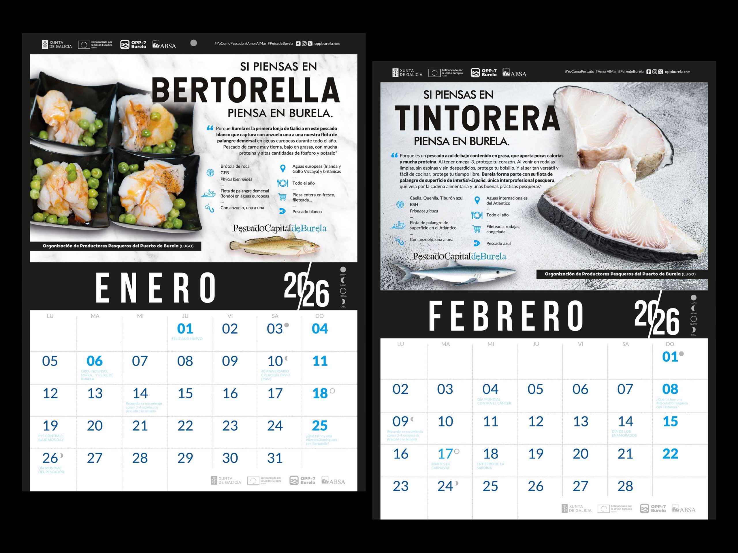 A lo largo de los próximos 12 meses el calendario 2026 de la OPP-7 vuelve a promocionar los “12 Pescados Capitales” del Puerto de Burela, en una acción cofinanciada por Xunta de Galicia y FEMPA, incluida en el plan de producción y comercialización anual de la OPP con el objetivo de contribuir a la trazabilidad de los productos de la pesca y al acceso de los consumidores a información clara y completa.