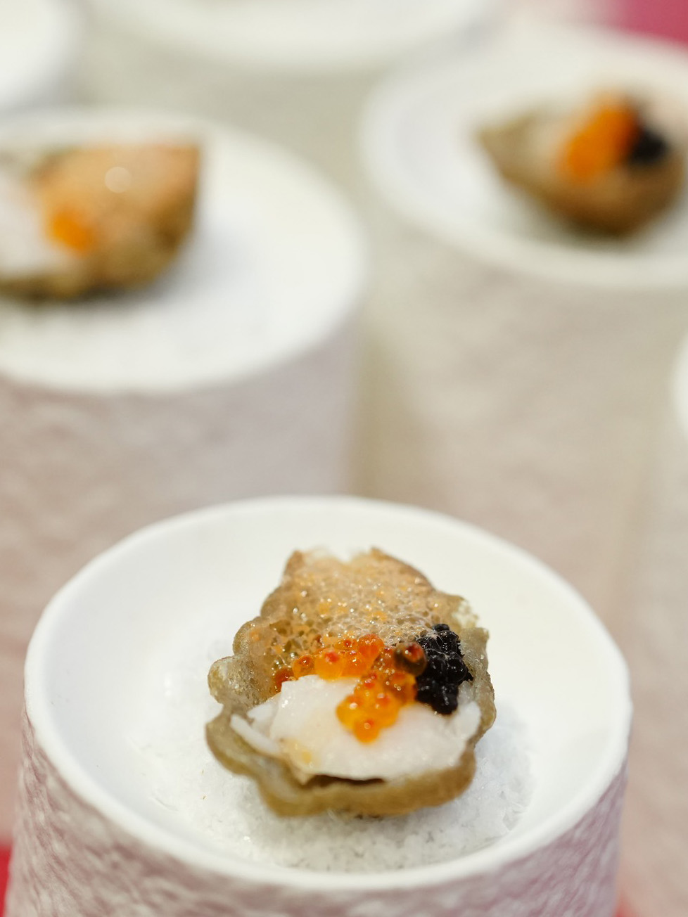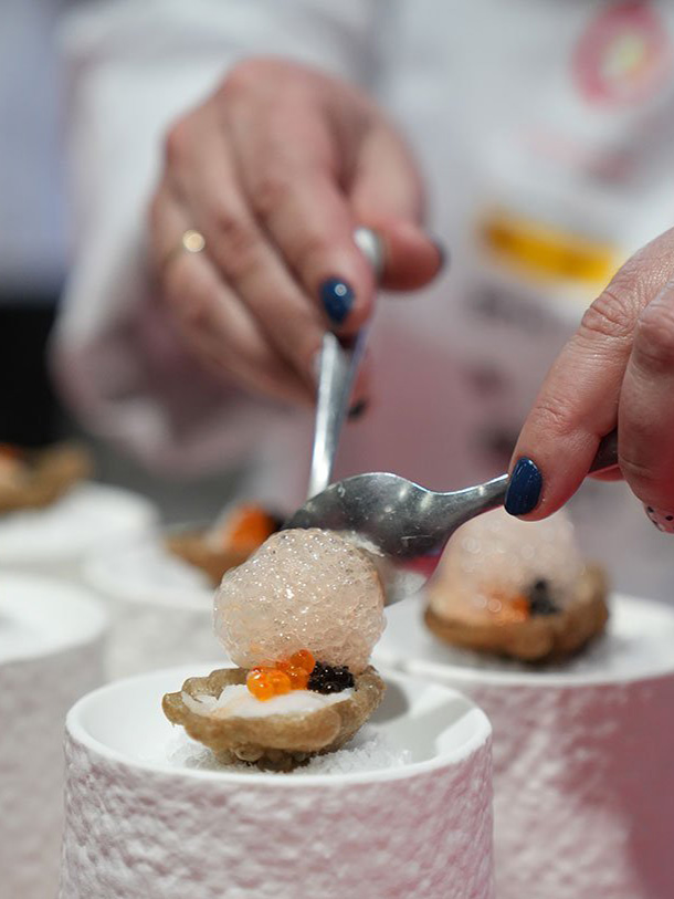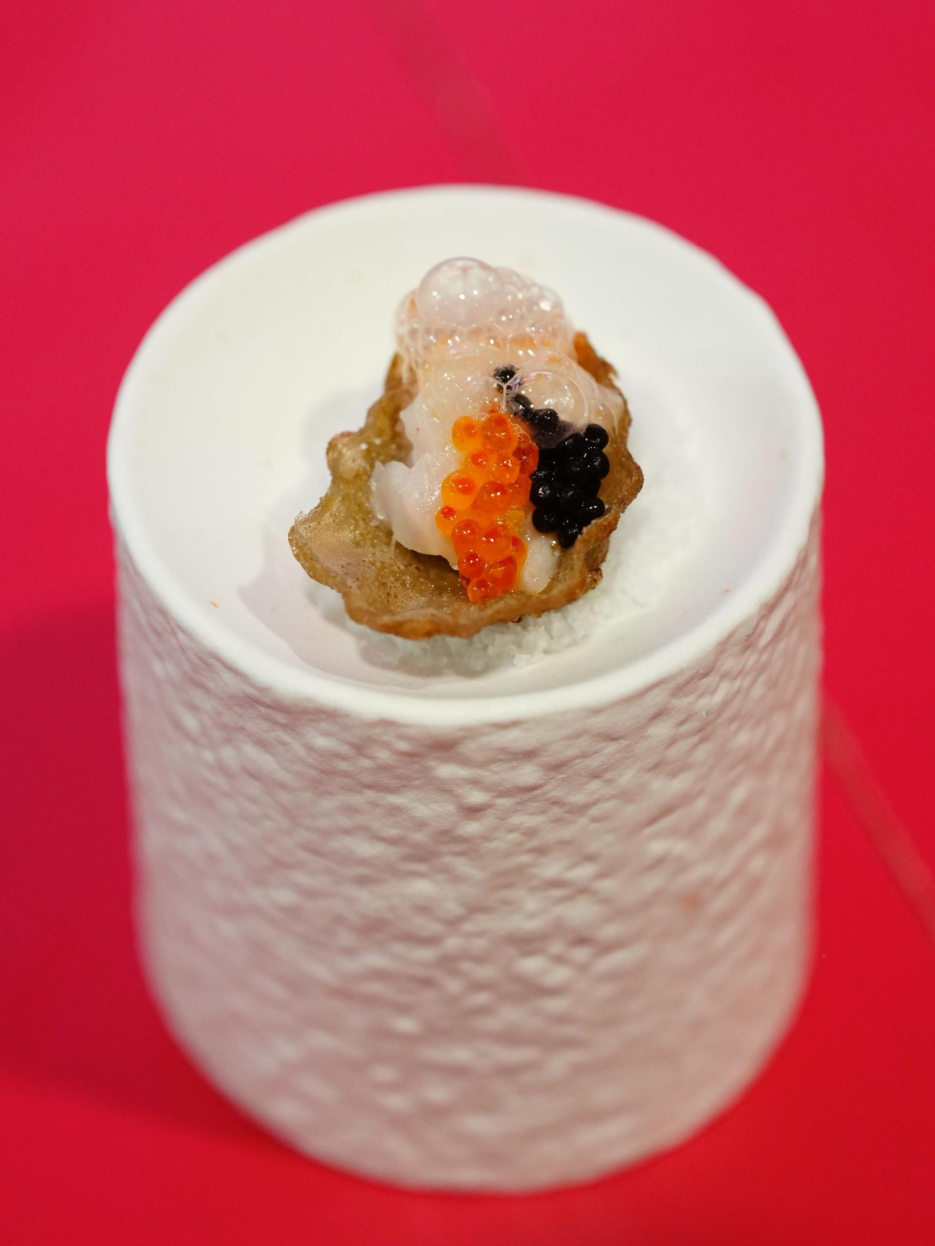 “Ostras, ¡Qué Merluza D& Burela!”: Trampantojo de falsa ostra hecho con galleta de tinta de calamar, rellena de gazpacho de gilda elaborado con aceite de oliva de Quiroga, merluza del pincho de Burela cocinada a baja temperatura y huevas de trucha, finalmente coronada con un aire de carabinero.