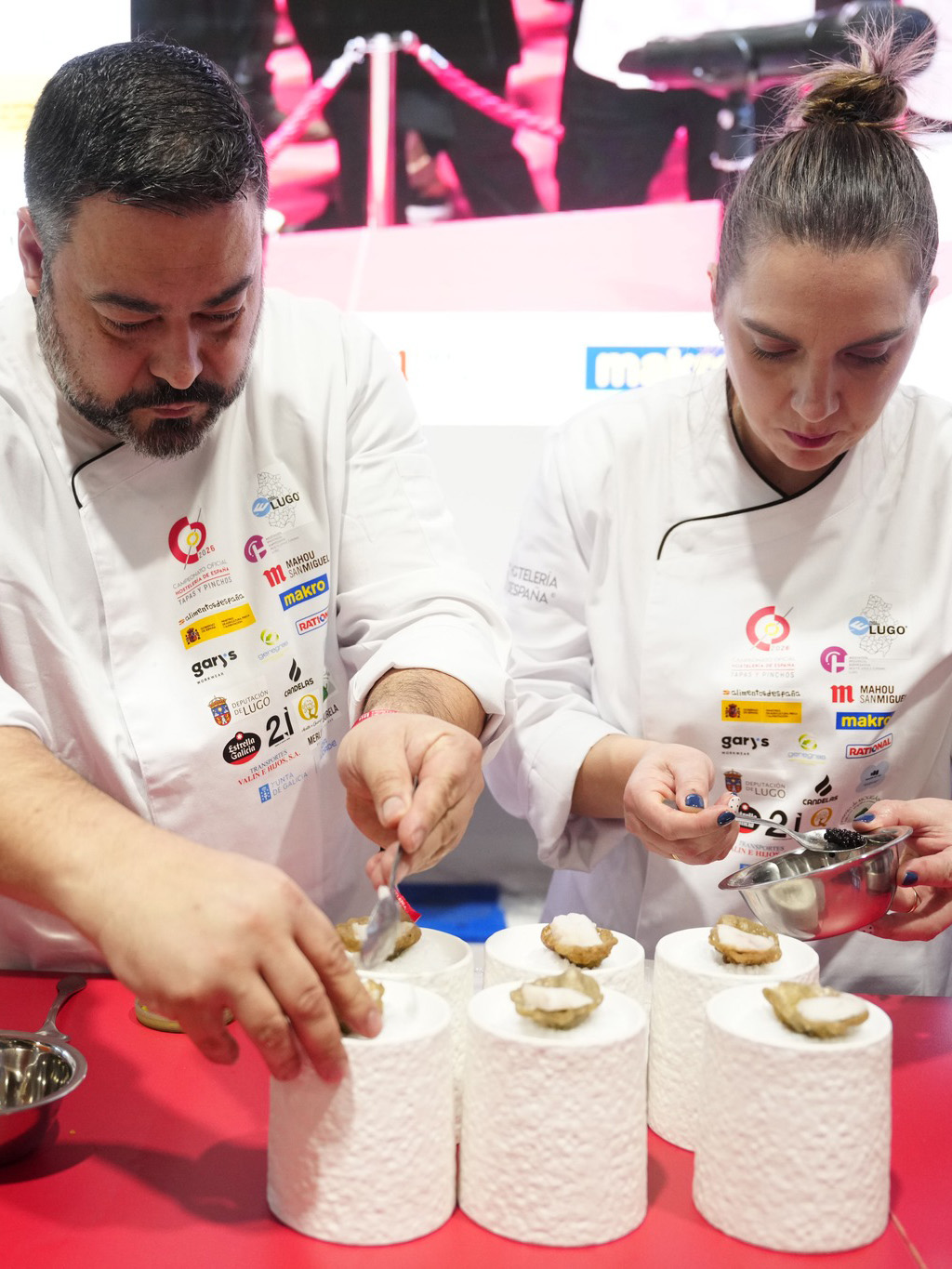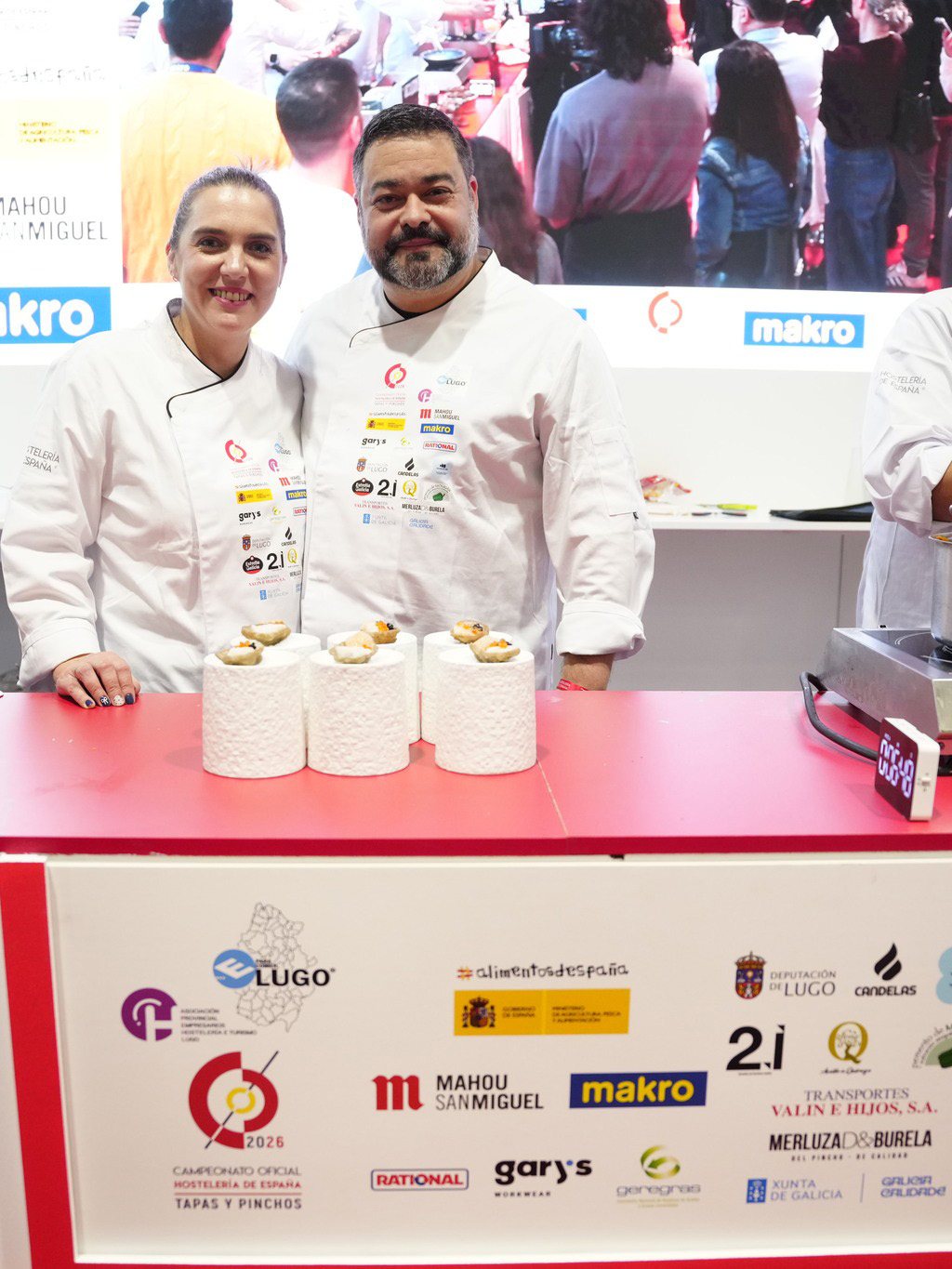 Tras superar la primera ronda de ayer, en la que participaron 34 asociaciones, la obra del cocinero José Luis Pardo y su ayudante Verónica Díaz, del restaurante El Boni (Lugo), se clasificó para la gran final entre los seis mejores del país luchando por el título a la Mejor Tapa/Pincho de España, que tuvo lugar esta mañana.