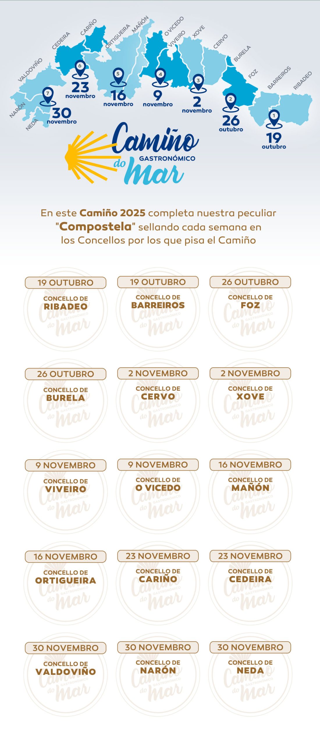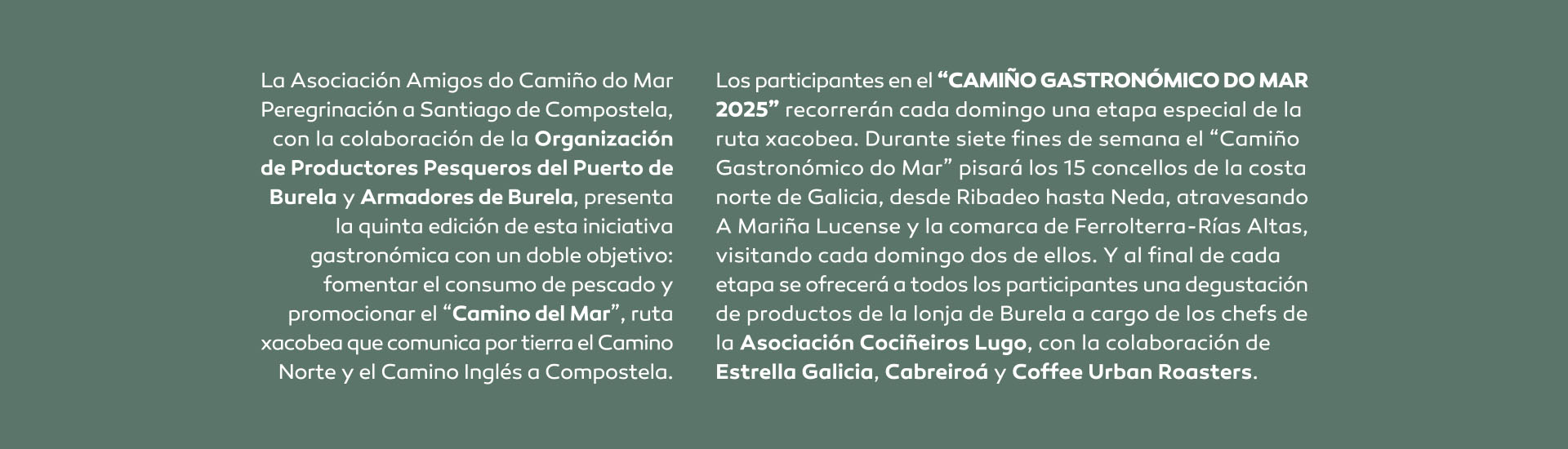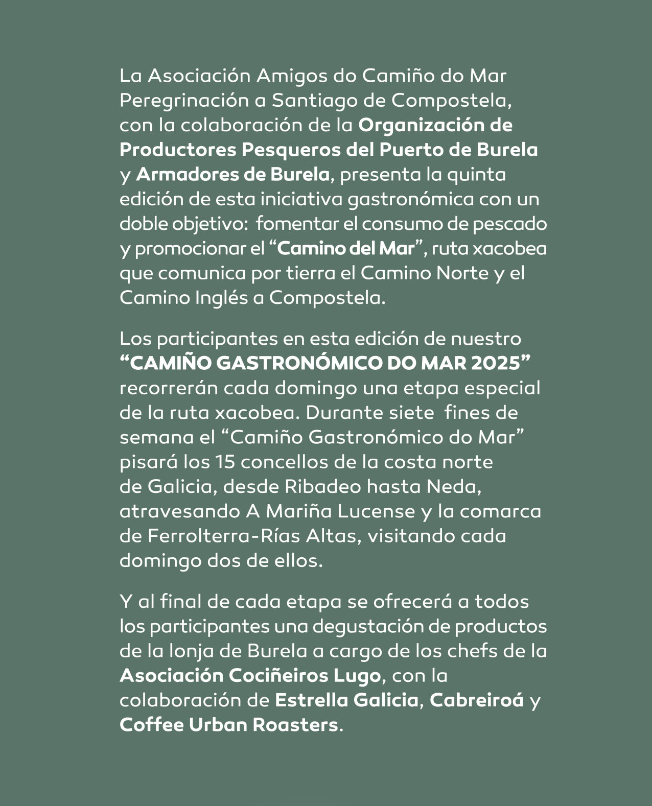 “CAMIÑO GASTRONÓMICO DO MAR”: DEGUSTACIONES DE PEIXE DE BURELA Al final de cada etapa del “Camiño Gastronómico do Mar 2024” se ofrecerá a todos los participantes una degustación de productos de la lonja de Burela a cargo de los chefs de la Asociación...